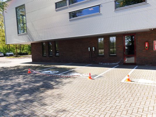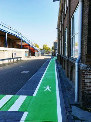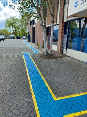 Voetgangersbelijning en wegmarkering rondom bedrijfspand.