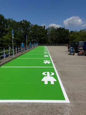 Groene parkeervakken inclusief E-laad logo, belijning en vaknummering. In verband met de gecoate vloer is deze eerst voorbehandeld en opgeschuurd zodat de hechting optimaal is. Er is gekozen voor een specifieke rustige kleur groen.