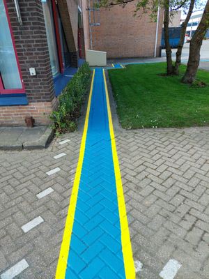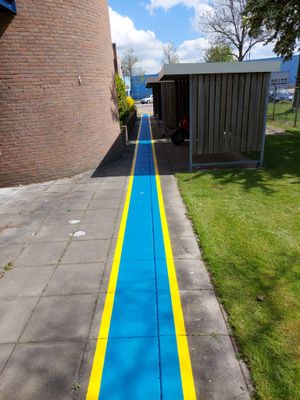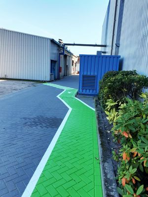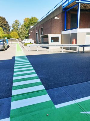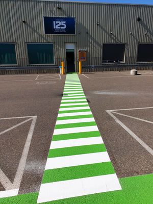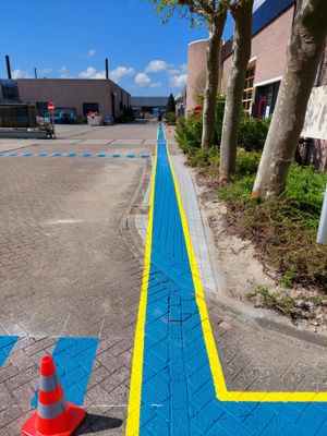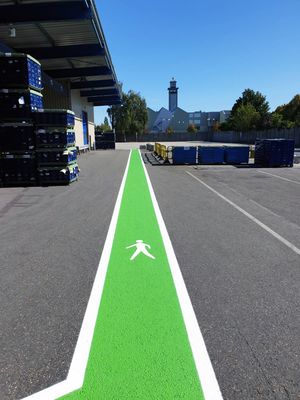 Veiligheidsverhogende wegmarkering en belijning voor voetgangers rondom bedrijfspand. Veilige looproutes voor voetgangers voorkomen gevaarlijke situaties met heftrucks en overige voertuigen.