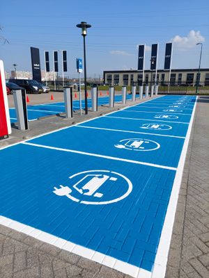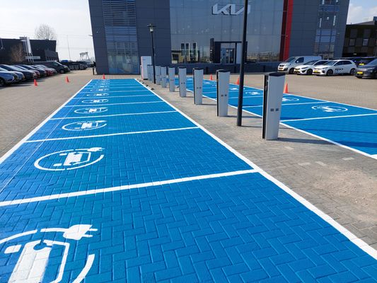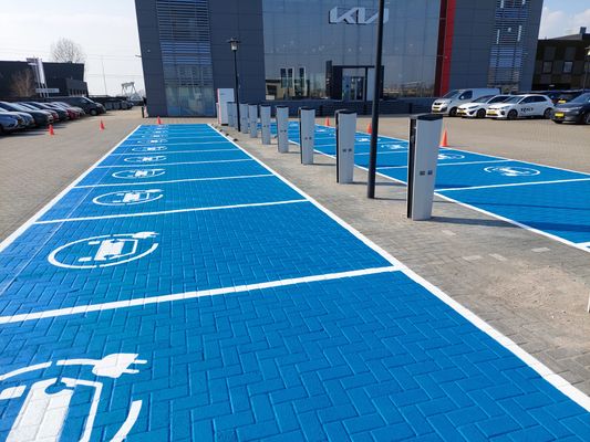 TrafficSuppy heeft bij Kia Nederland diverse wegmarkeringen aangebracht. Deze opvallende blauwe parkeervakken met E-laad symbool, dienen ter verduidelijking en herkenbaarheid van de laadpalen op dit laadplein.