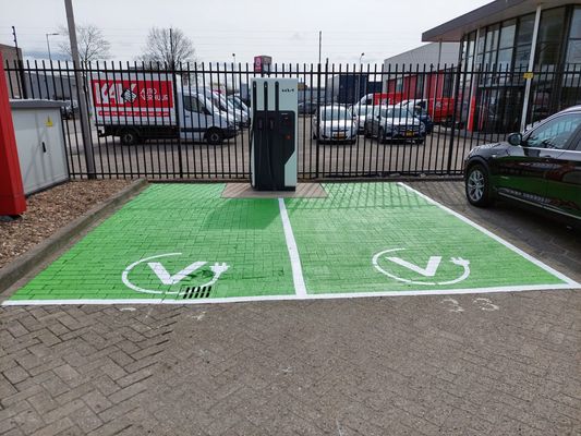 TrafficSuppy heeft bij Frank Vaneman Automotive diverse wegmarkeringen aangebracht. Deze wegmarkeringen zijn aangebracht op de parkeervakken welke voorzien zijn van een laadpaal, en zijn herkenbaar uitgevoerd in een groen witte kleurstelling met een duidelijk custom-made symbool met daarin het logo van de eindklant verwerkt. Daarnaast zijn de verschillende parkeerplaatsen ook voorzien van nummering.