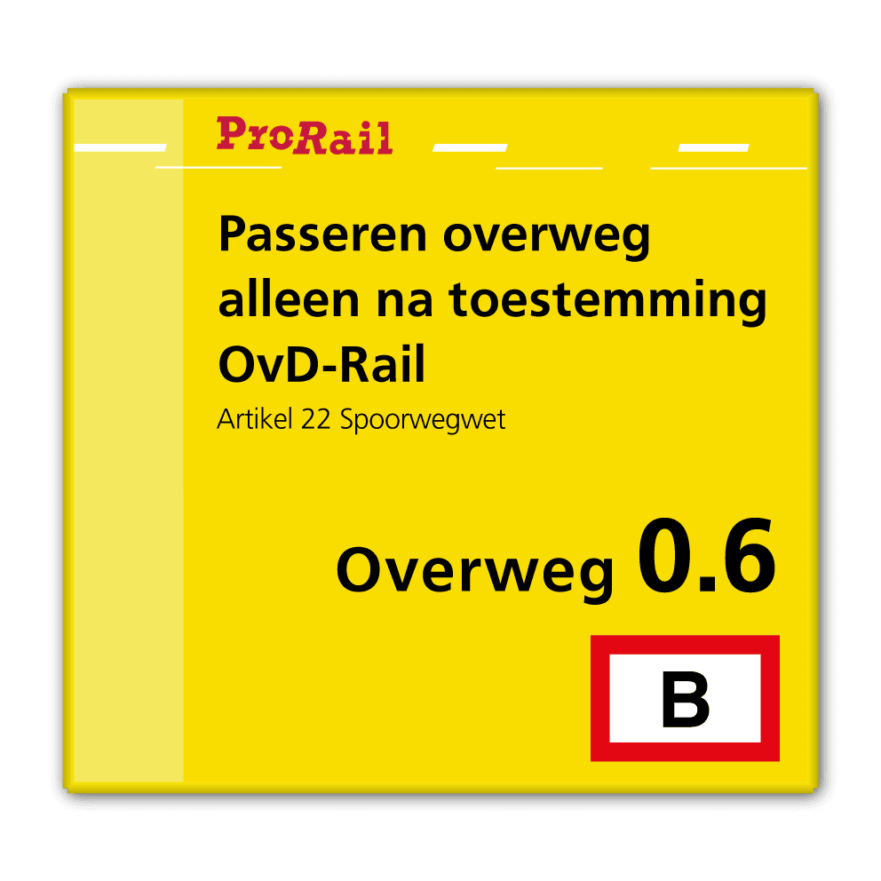 Waarschuwingsbord ProRail - Passeren overweg alleen na toestemming OvD-Rail - 500x500mm