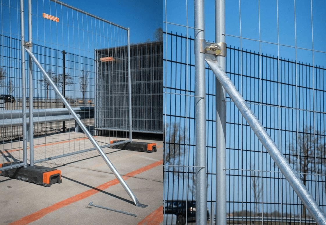 Een schoor met grondpen is essentieel voor het stabiliseren van bouwhekken. Na minimaal 1 tot 3 bouwhekken dient er een schoor geplaatst te worden om de stabiliteit aanzienlijk te verhogen. Voor bouwhekken die voorzien zijn van een doek is het noodzakelijk om ieder bouwhek te schoren en bij harde wind te verankeren met een grondpen.